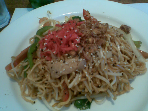 I went for the Yaki Soba, described as "teppan-fried soba noodles with egg, chicken, shrimps, onions, green and red capsicum, beansprouts and spring onions. garnished with mixed sesame seeds, fried shallots and pickled ginger". It tasted like instant noodles with 2 bits of chicken, with heaps of onion and capsicum, and very little taste. The picked ginger was grated and hard to get rid of (I don't like it and I thought it'd be sliced like other sushi joints).